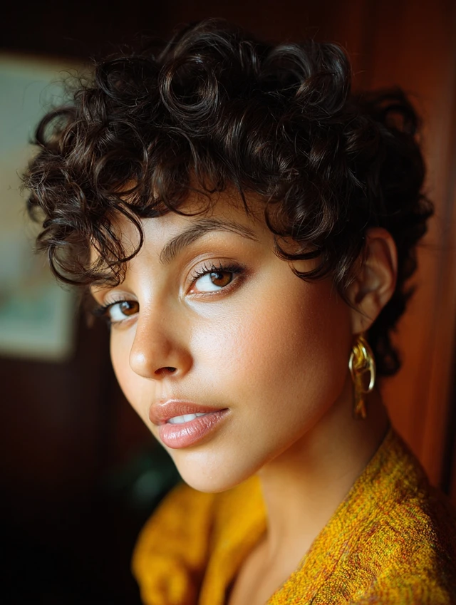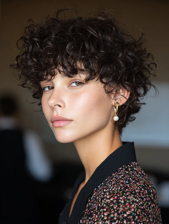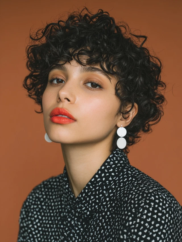 Short fringe adds personality while keeping the overall shape playful and modern. Bangs are cropped just above the brows, letting tiny curls form a bold focal point across the forehead. That detail highlights eyes instantly and pairs well with slightly longer layers elsewhere for balance. Styling requires patience when defining the front section, but results feel striking. This cut suits confident wearers who enjoy statement details and expressive curl patterns.