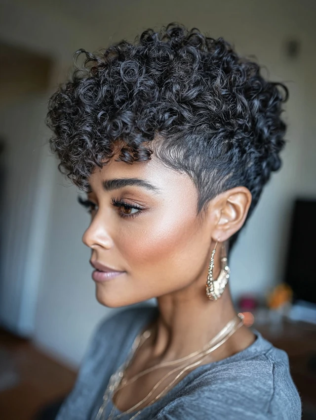 Careful curl-by-curl shaping gives this pixie a sculpted, high-definition finish that still feels natural. Each ringlet is trimmed to encourage spring and uniformity, preventing random flat spots around the crown. The sides remain tidy so the curls become the star, drawing attention upward and outward beautifully. Styling focuses on hydration and gentle scrunching rather than heavy manipulation. This look suits anyone wanting precision without stiffness, while celebrating every spiral proudly.