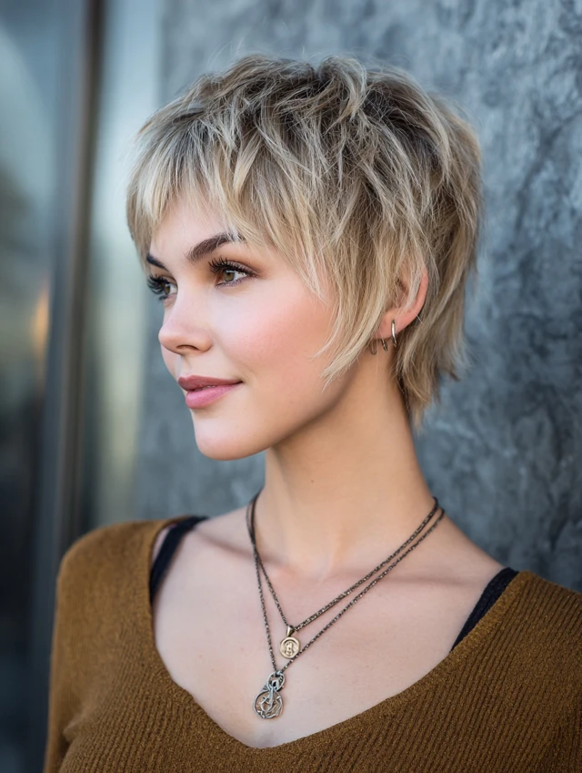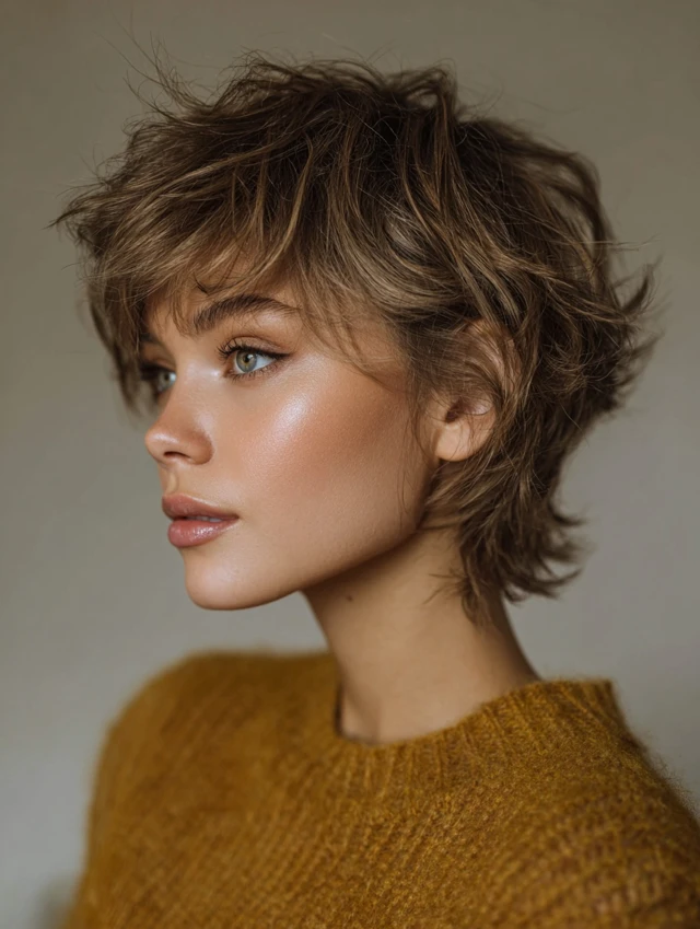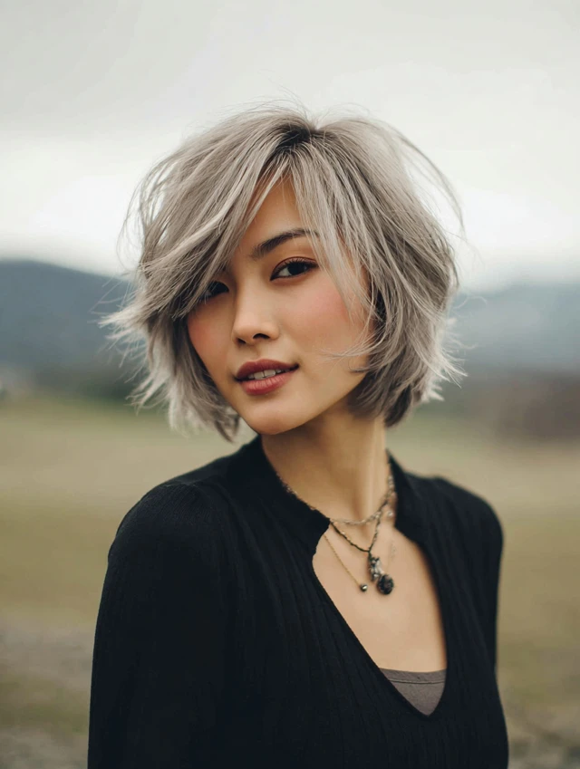 Purposefully imperfect styling gives this take its cool, undone personality without appearing sloppy. Shorter layers throughout encourage separation, while the outline stays soft and touchable. Dry shampoo or texture powder boosts grit instantly, especially at the roots. The haircut grows out attractively, making maintenance simple between appointments. Best for straight to wavy hair, this variation appeals to anyone who prefers effortless mornings and loves styles that look better the less they’re fussed over.