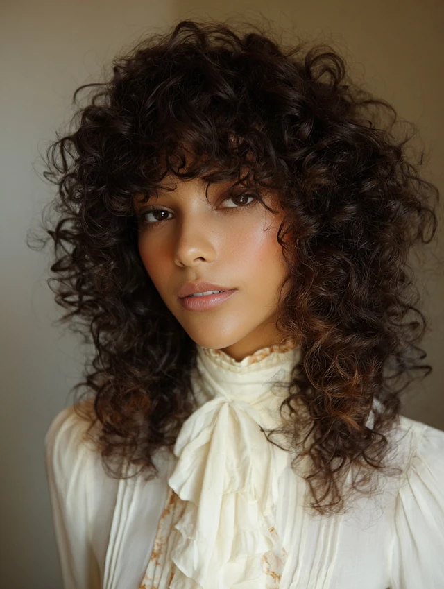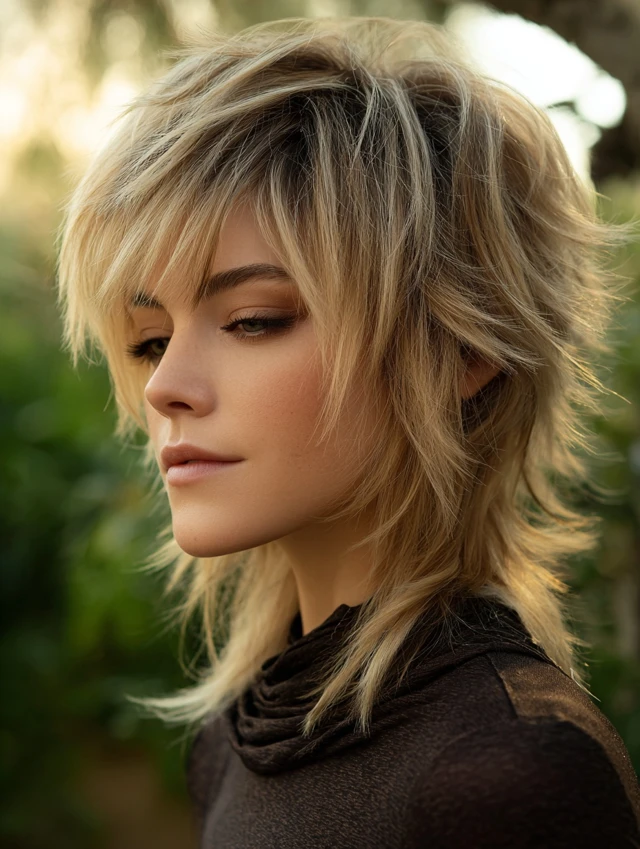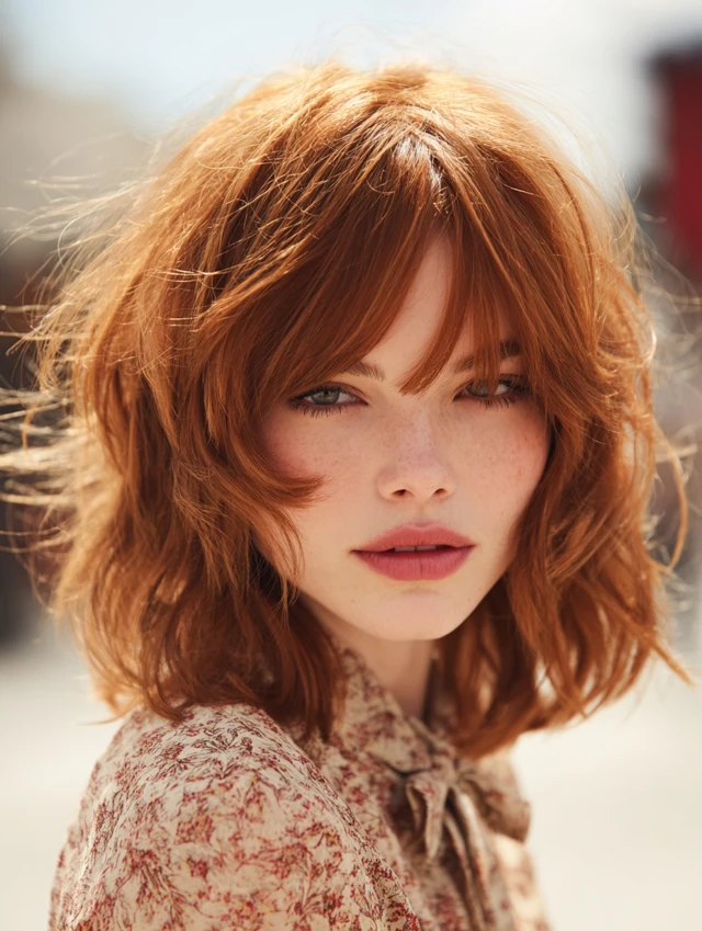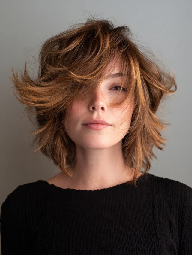 Ultra-short bangs bring an edgy twist to the otherwise soft, layered silhouette. The fringe highlights the eyes, while longer sides prevent the look from feeling harsh or overly retro. Interior layering keeps weight controlled through the crown and ends. Styling cream helps define the bangs while keeping the rest flexible and airy. Best for confident personalities, this variation suits oval and heart face shapes especially, delivering contrast, personality, and a playful modern vibe.