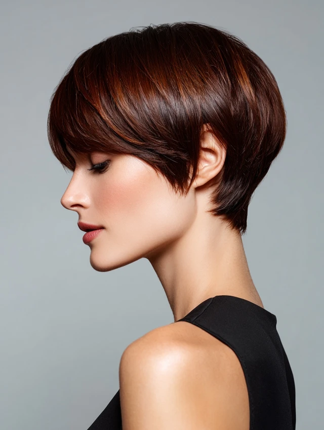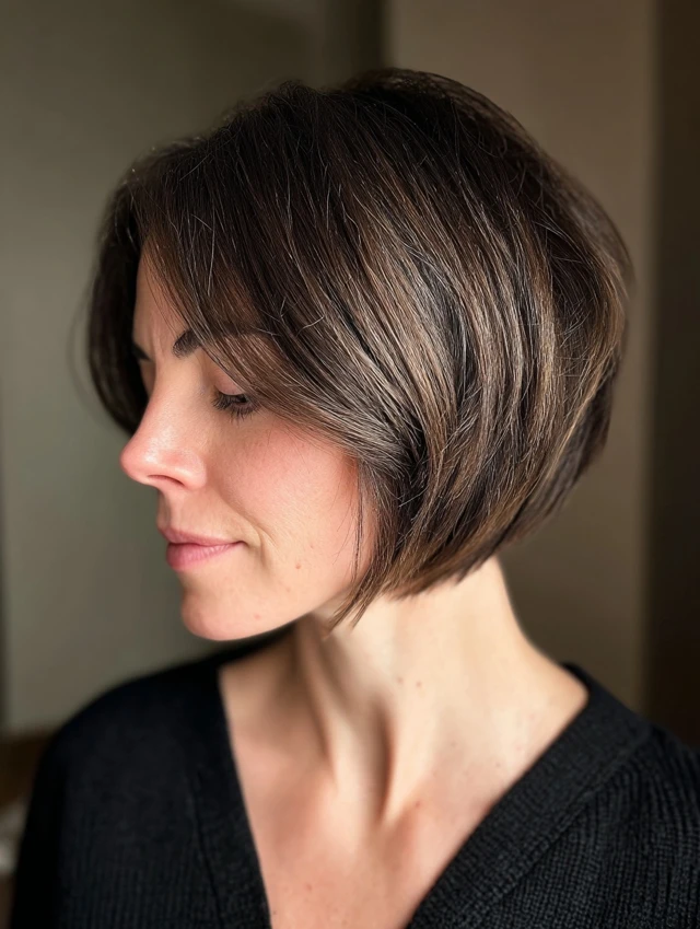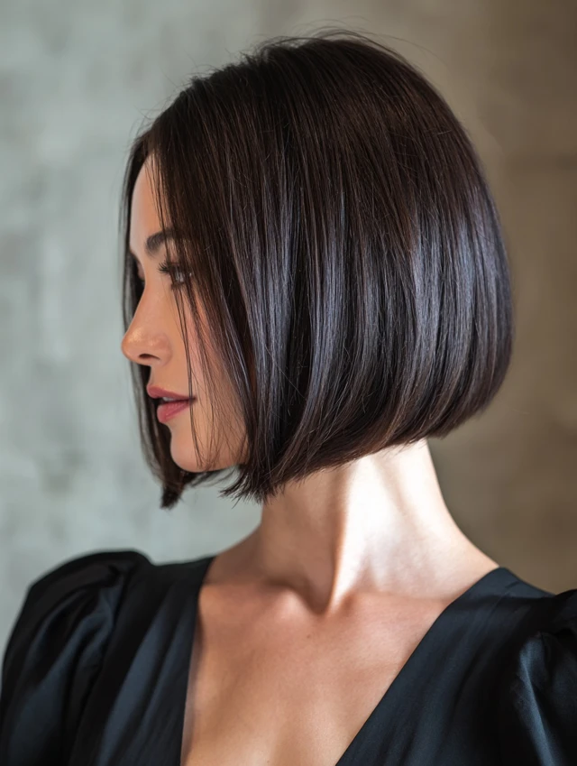 A gently tapered nape keeps this version refined, while longer layers toward the front maintain softness and flow. The back sits close to the head, giving structure without appearing severe. Blow-drying with a paddle brush smooths everything quickly, then a drop of serum adds shine. Because the graduation is subtle, the haircut grows out neatly and needs fewer touch-ups. This option works beautifully for straight to lightly wavy hair and anyone craving a clean, elegant finish.