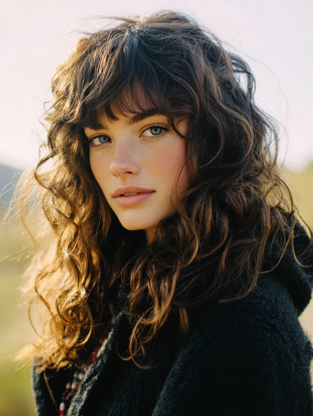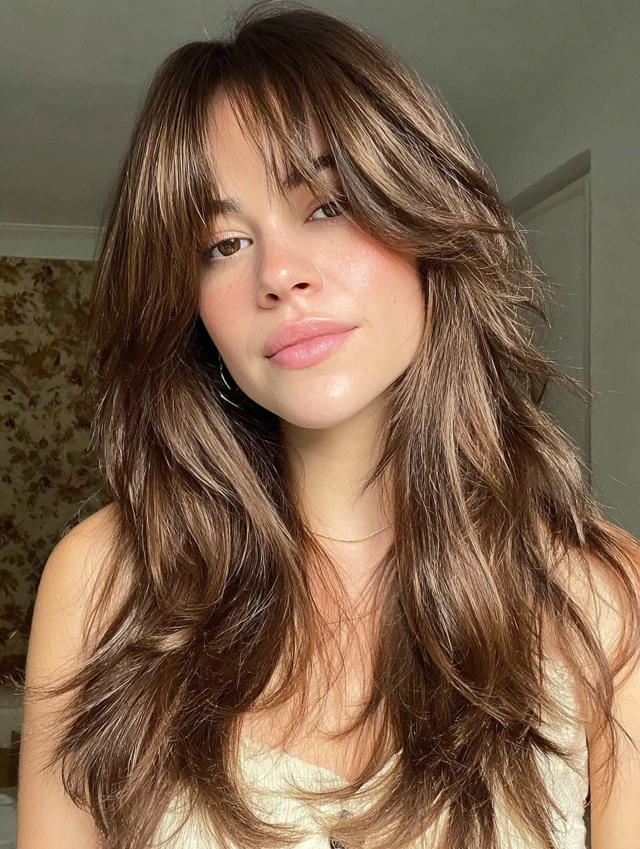 An airy fringe pairs with choppy layers to create a relaxed, cool-girl vibe that never feels forced. Texturizing through the mid-lengths adds separation, while the bangs soften the forehead and draw attention to the eyes. Scrunching mousse into damp hair enhances natural wave patterns quickly. Because the fringe blends into the sides, upkeep remains manageable between trims. This style flatters round and square faces especially, offering balance while keeping the overall silhouette fresh and playful.