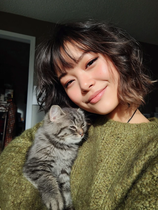 Evenly distributed layers create harmony between volume, length, and shape in this timeless interpretation. The crown gets gentle lift, the sides skim the cheeks, and the ends taper softly for flow. Styling stays flexible, whether smooth, wavy, or lightly tousled. Because nothing feels extreme, the haircut flatters many face shapes and ages gracefully between trims. This balanced version is perfect for first-timers, delivering the kitty-cut aesthetic in a universally appealing, easygoing way.