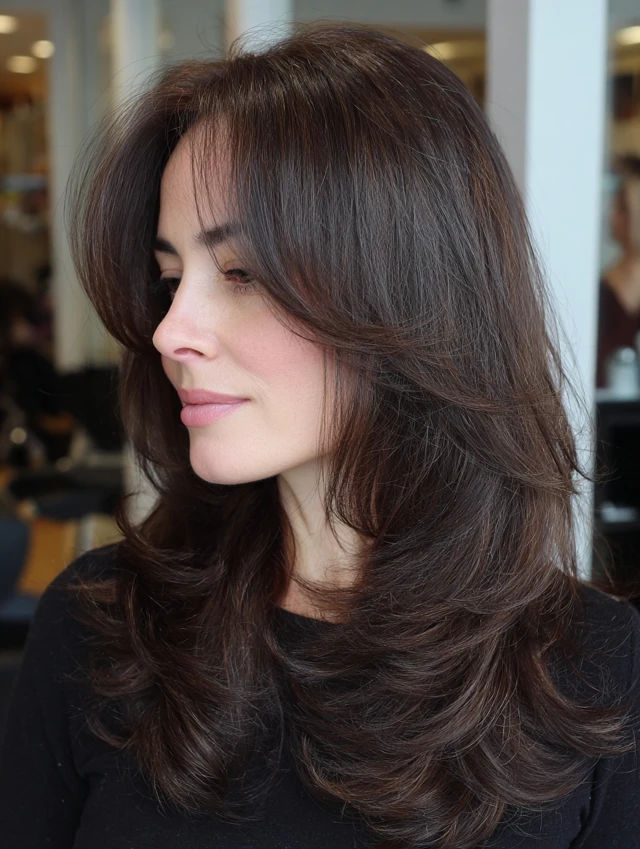 Soft curtains open at the center, blending into cheek-skimming layers that frame the face gently. Volume concentrates near the crown, while feathered ends prevent heaviness around the perimeter. Blow-drying with a medium round brush gives shape quickly, and light hairspray keeps movement flexible. The cut flatters longer face shapes especially well, adding width through the sides. Its balanced proportions make it easy to style daily, whether worn smooth for work or tousled casually on weekends.