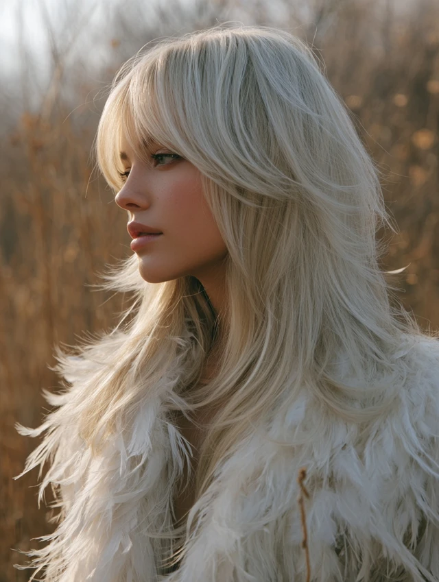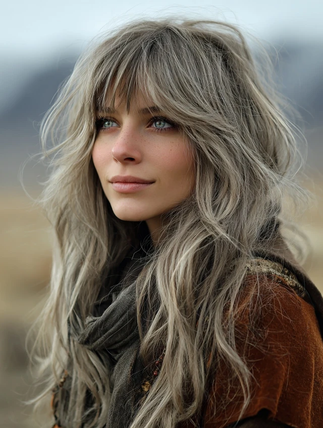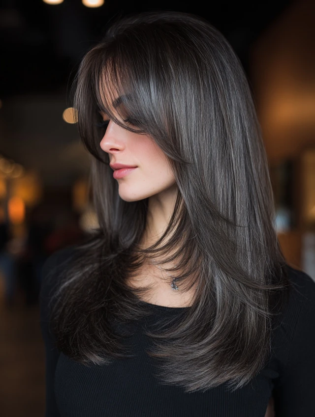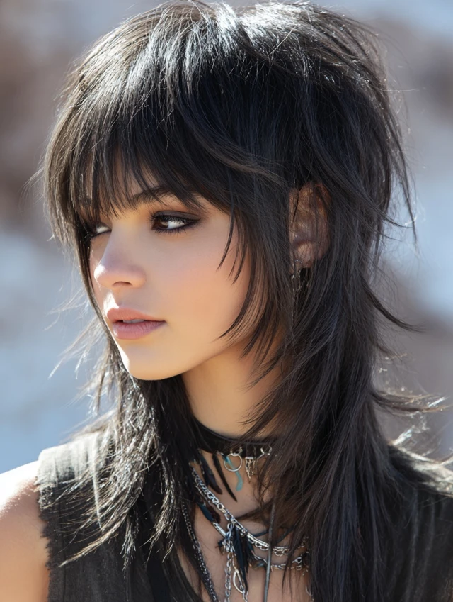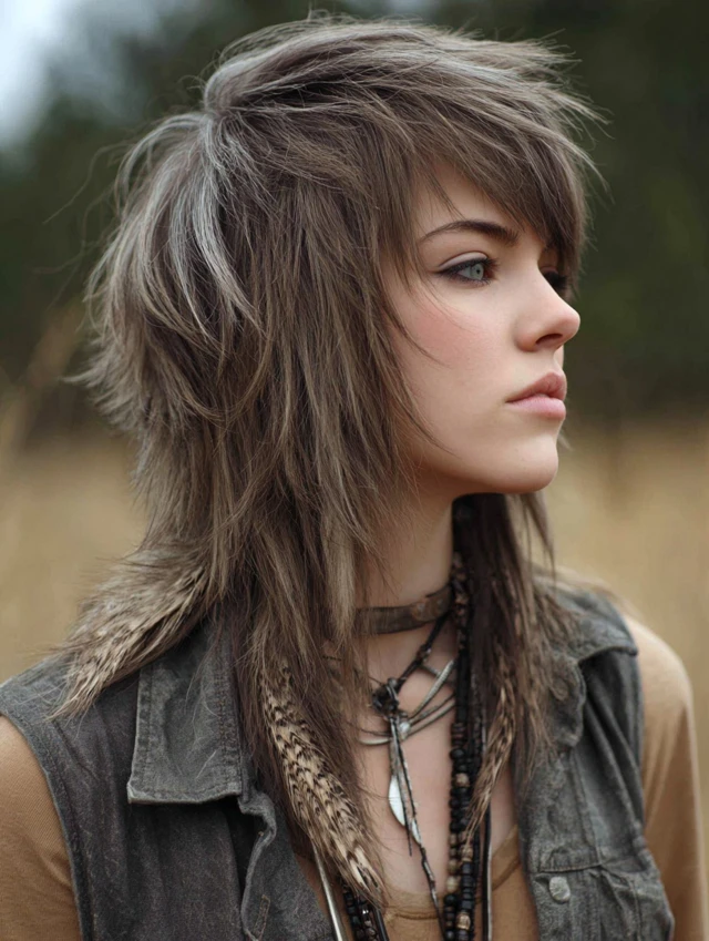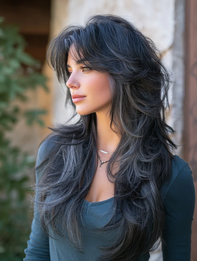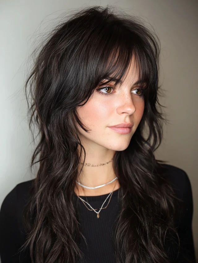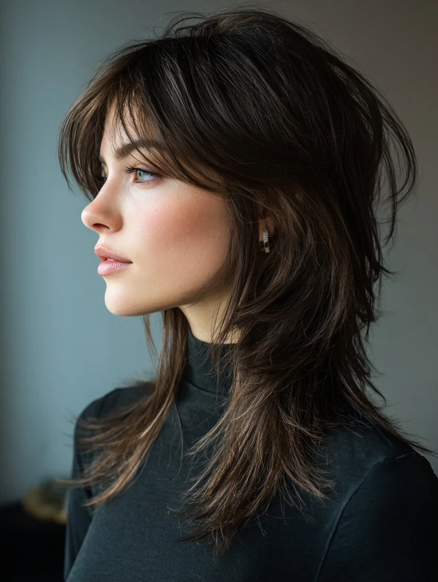 Long Wolf Cut with Side-Swept Bangs