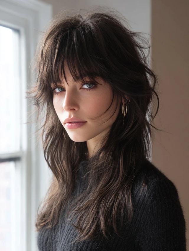 A center-parted fringe modernizes the long wolf cut, giving symmetry and softness across the face. The bangs melt into cheek-length layers, creating natural contouring without harsh lines. Crown volume adds lift, while extended lengths keep the profile dramatic and fluid. Straightening or lightly waving the fringe changes the vibe instantly. This option works well for people who enjoy versatility, since it flatters multiple face shapes and transitions smoothly between casual styling and elevated evening looks.