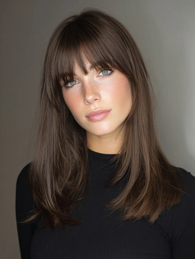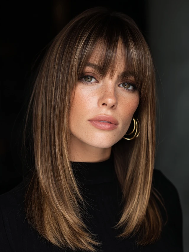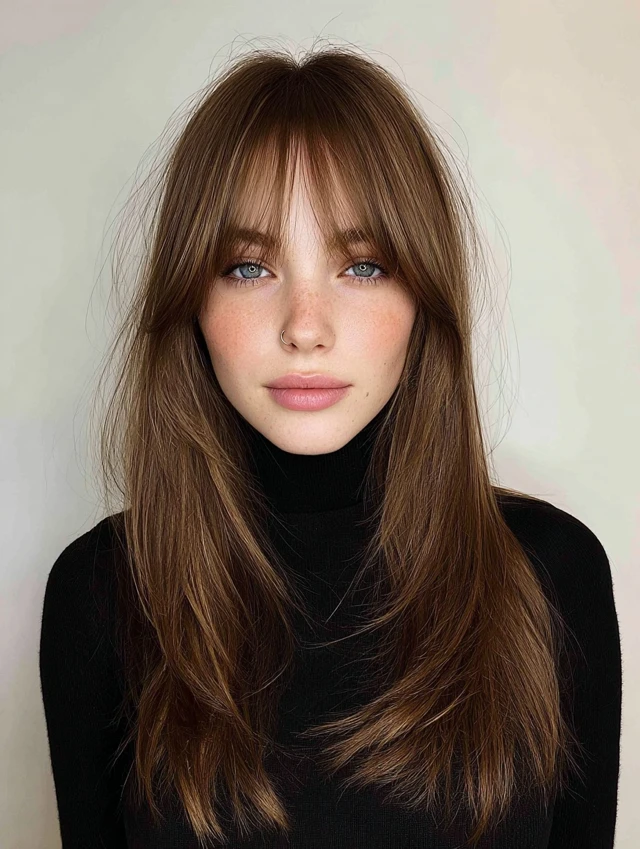 Curtain bangs soften facial features and highlight the eyes and cheekbones.
