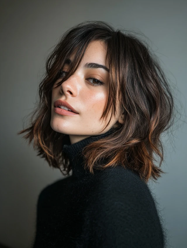Feather-light bangs bring softness and approachability to this textured shaggy lob style. The fringe melts into cheek-grazing layers, creating a seamless flow from front to back. Length stays around the shoulders, keeping the cut versatile and easy to grow out. Blow-drying the bangs with a small round brush adds polish, while scrunching the rest preserves casual energy. It flatters fine to medium hair especially well without sacrificing fullness.