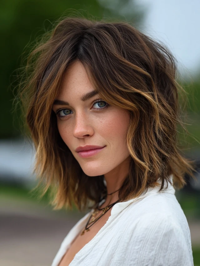Loose waves define this breezy shaggy lob, giving it a vacation-ready mood all year long. Strategic layering enhances natural texture, allowing bends and curls to fall organically rather than stacking awkwardly. Ends remain slightly uneven for that sun-kissed, undone effect. Scrunching in curl cream or using a wide-barrel wand keeps things relaxed and imperfect. It flatters round and oval faces beautifully while staying low-stress for daily styling routines.