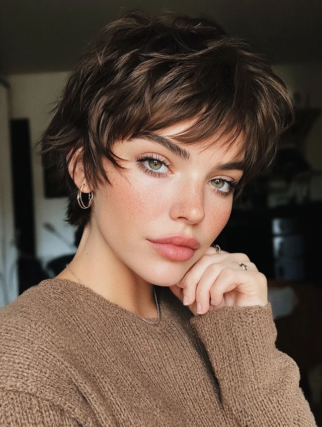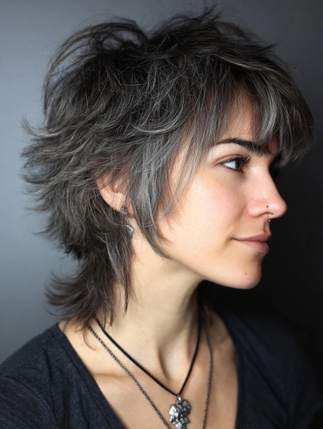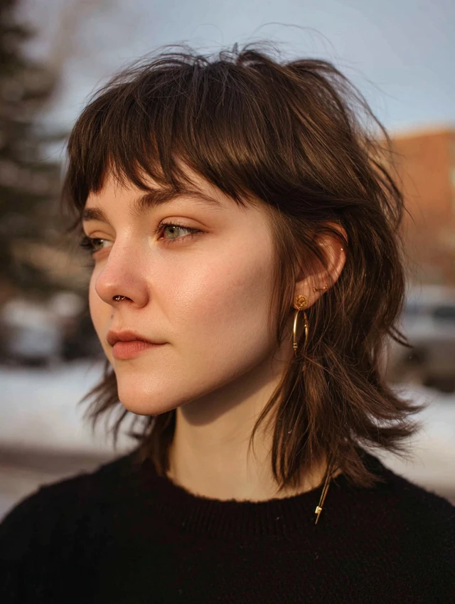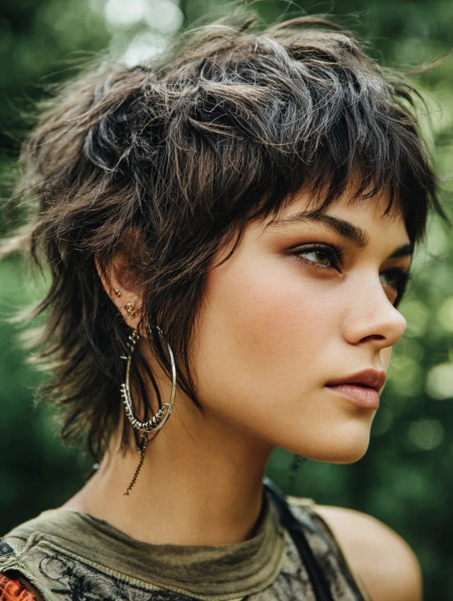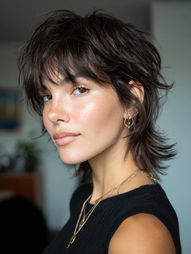 Messy texture defines this cropped wolf cut, creating carefree energy that feels intentional rather than accidental. Curtain bangs remain light and airy, breaking up density around the temples while spotlighting the eyes. Subtle graduation at the back keeps the neckline tidy without losing attitude. Styling involves little more than finger-tousling paste into dry hair for separation. The finished look suits busy lifestyles, offering edge without demanding constant salon-level maintenance.
