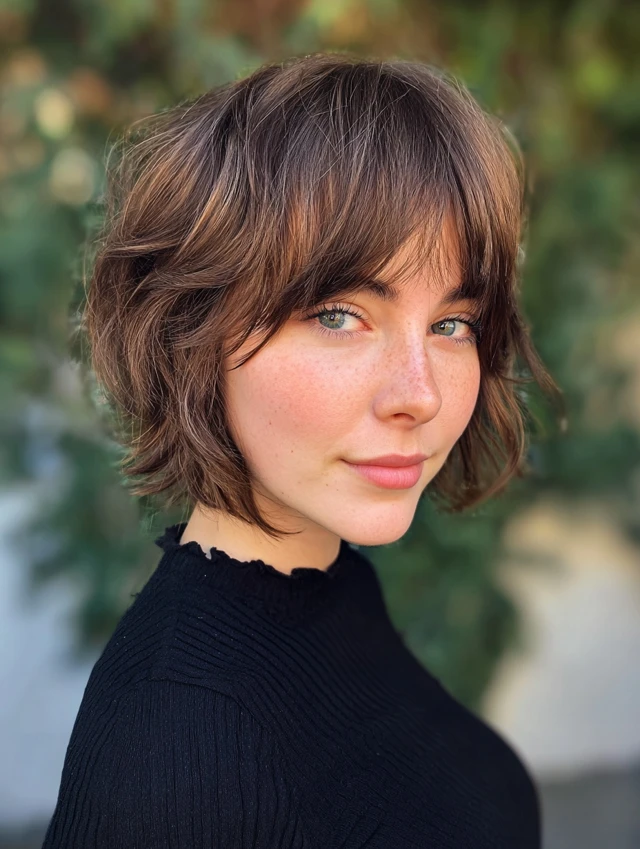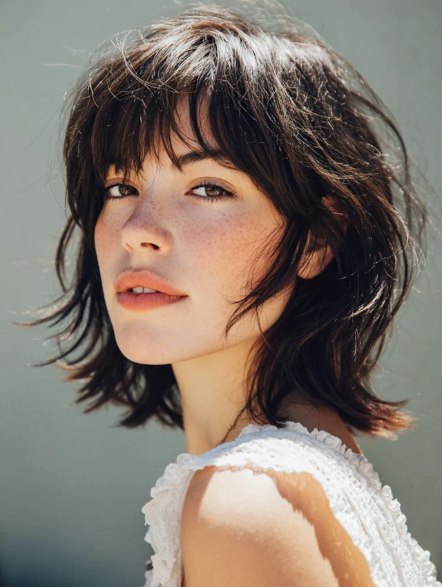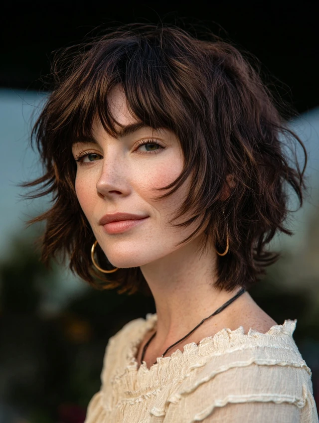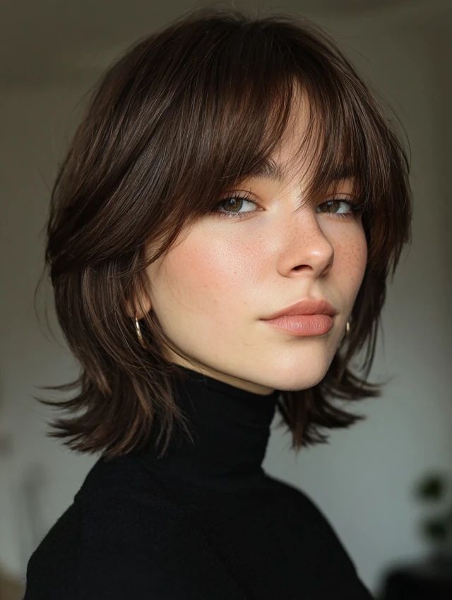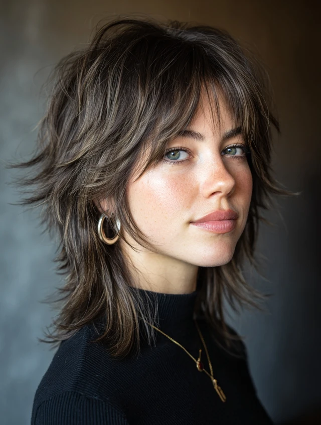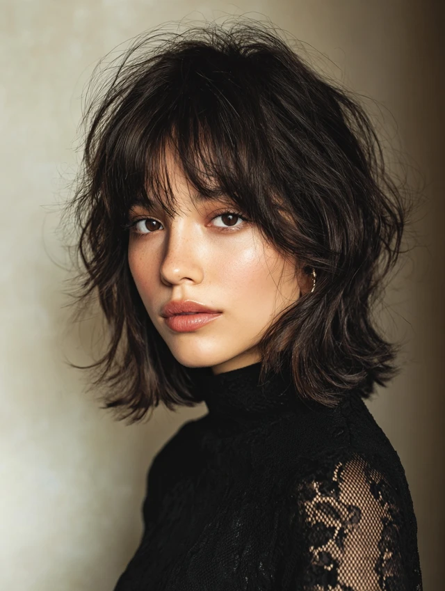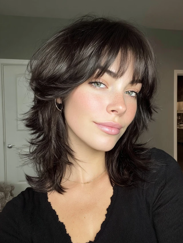 A tighter silhouette keeps this shag-wolf hybrid controlled while preserving its signature layered movement. Curtain bangs curve subtly, blending into cheek-length pieces that contour the face beautifully. Shorter layers through the crown prevent heaviness, making medium-density hair especially cooperative. Styling involves light mousse and rough-drying for natural lift, followed by smoothing the fringe slightly. The outcome feels relaxed, versatile, and perfect for everyday wear without losing edge.