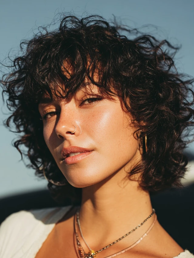 Natural curls thrive in this compact wolf cut because layered shaping prevents bulk while encouraging springy definition. Curtain bangs fall in loose arcs, blending seamlessly into side curls for a flattering, face-brightening effect. Shorter sides maintain balance, keeping the silhouette crisp rather than triangular. Diffusing with curl cream preserves bounce, while finger styling keeps texture organic. It’s a confident option for embracing curl patterns without sacrificing structure.