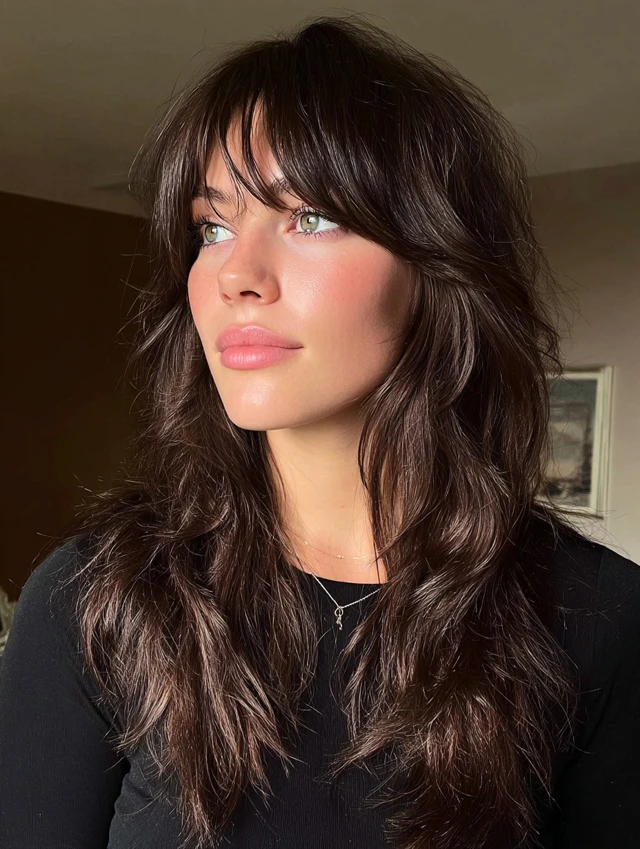 Sharper outlines modernize this wolf cut, giving it crisp definition along the sides and nape. Curtain bangs remain airy and flexible, opening the face while preventing the style from feeling severe. Controlled layering through the top provides movement without excessive volume. Styling focuses on smoothing the perimeter with a brush, then loosening crown pieces using fingers. It’s a polished take on the trend for those who love structure with subtle softness.