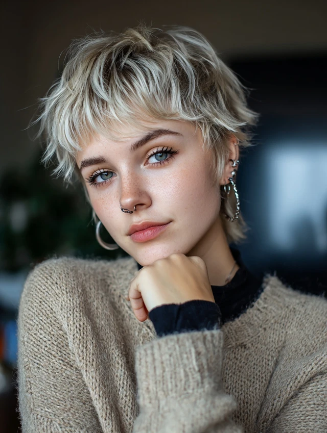 Bold choppy layers transform this pixie-length wolf cut into something edgy yet approachable. Curtain bangs sweep diagonally, softening strong jawlines and drawing attention upward toward the eyes. Volume stacks near the crown, helping thin hair appear fuller without heavy teasing. Scrunching mousse into damp strands encourages separation, while a quick blow-dry sets direction. The result feels modern, playful, and perfect for anyone craving a short style with personality.